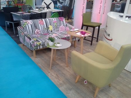Dans une ambiance plus nordique, le fauteuil Pam ou les tables SOREN  reprenaient le style fifties aux formes rondes et aux tons gais.