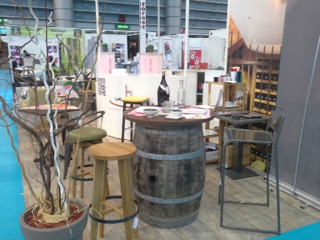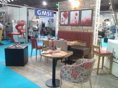 Plus loin ,dans un décor de salle de restaurant aux couleurs dégradées de rouge ,la nouvelle banquette Lilie ,la chaise Flashing ou le fauteuil Brigida étaient une invitation à s’assoir.