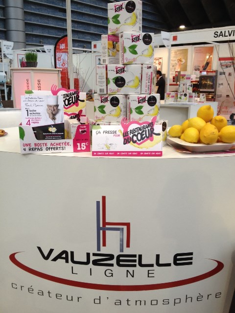 En effet , nous avons présenté les kits de boites de presse-citron. Chaque visiteur sur notre stand s’est vu offrir une boite de presse citron. A chaque boite , ce sont 4 repas distribués par les Restaurants du Cœur.