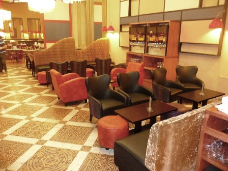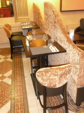 L’aménagement du mobilier est créé par deux banquettes Colysée formant vagues, assise lounge, d’un côté, d’une banquette Mauresque dos capitonnée en vis-à-vis.