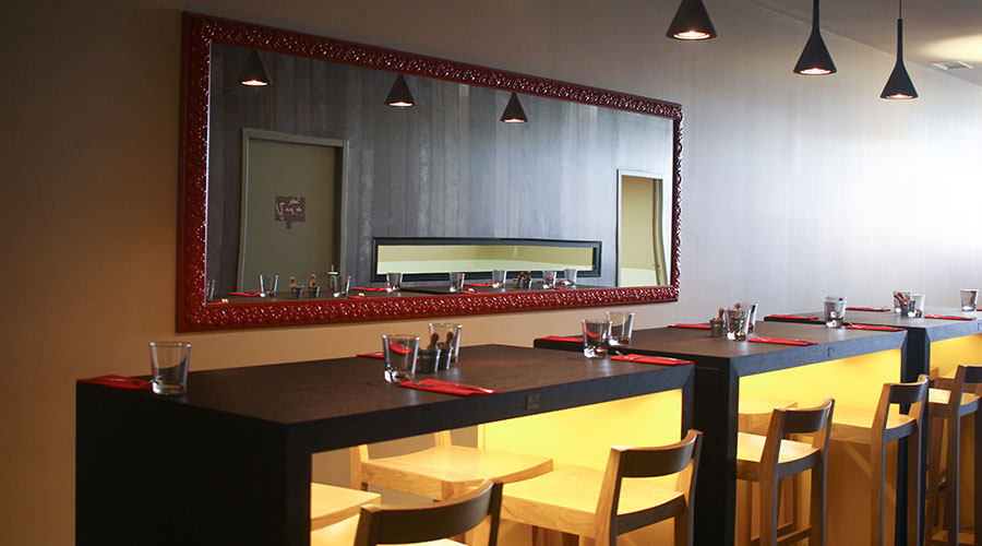 La chaise Jules en chêne a trouvé sa place au milieu des tables faite de plateaux épais, revêtus de stratifié Hubbler, et de piètements rétro. Une association qui aurait pu choquer dans d’autres lieux, mais qui finalement rehausse encore le choix de faire cohabiter modernisme et tradition.