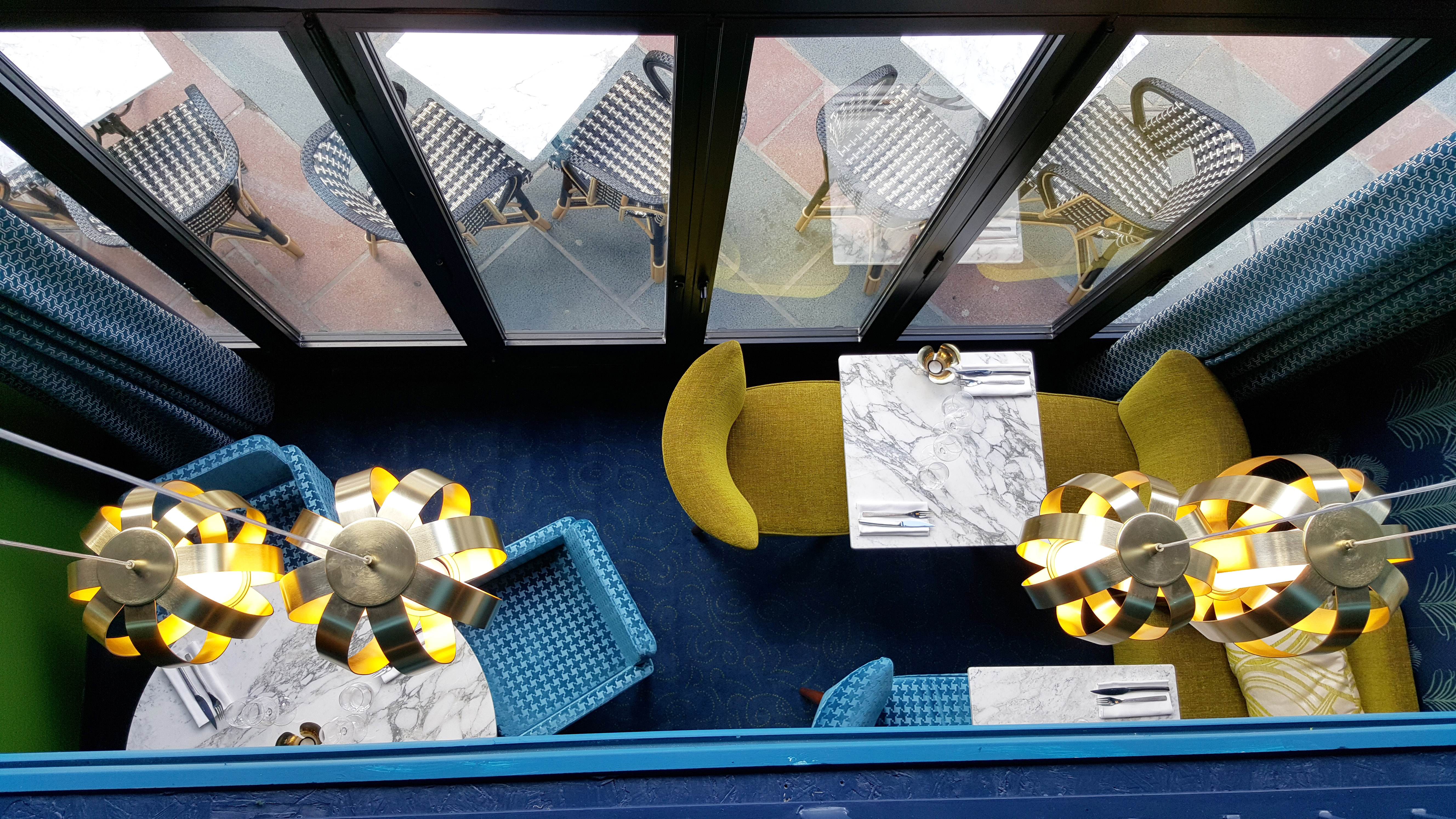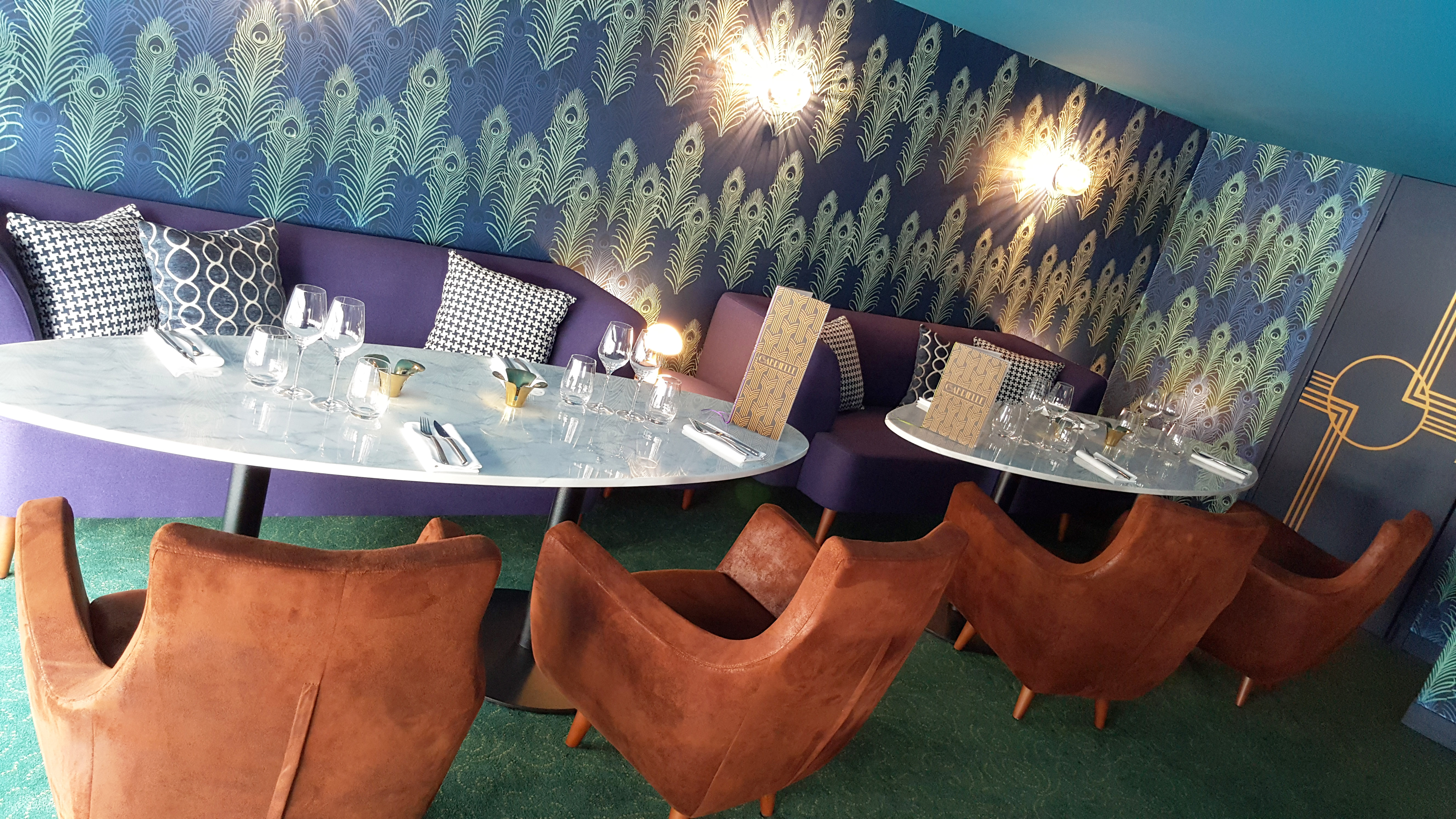 La pureté des plateaux de table en Marbre , les revêtements géométriques de chez Edmond Petit présents sur la chaise Pauline. Et enfin l’effet vintage sur les fauteuils Pam.